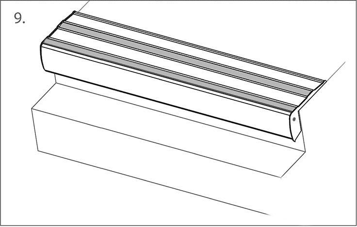 Профиль фиксируется саморезом в ступень под дальней от края ступени противоскользящей полосой.